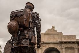 Nog tot en met 19 april 2026 staat een reuze metalen soldaat op het foto-eiland aan de Menenpoort in Ieper.